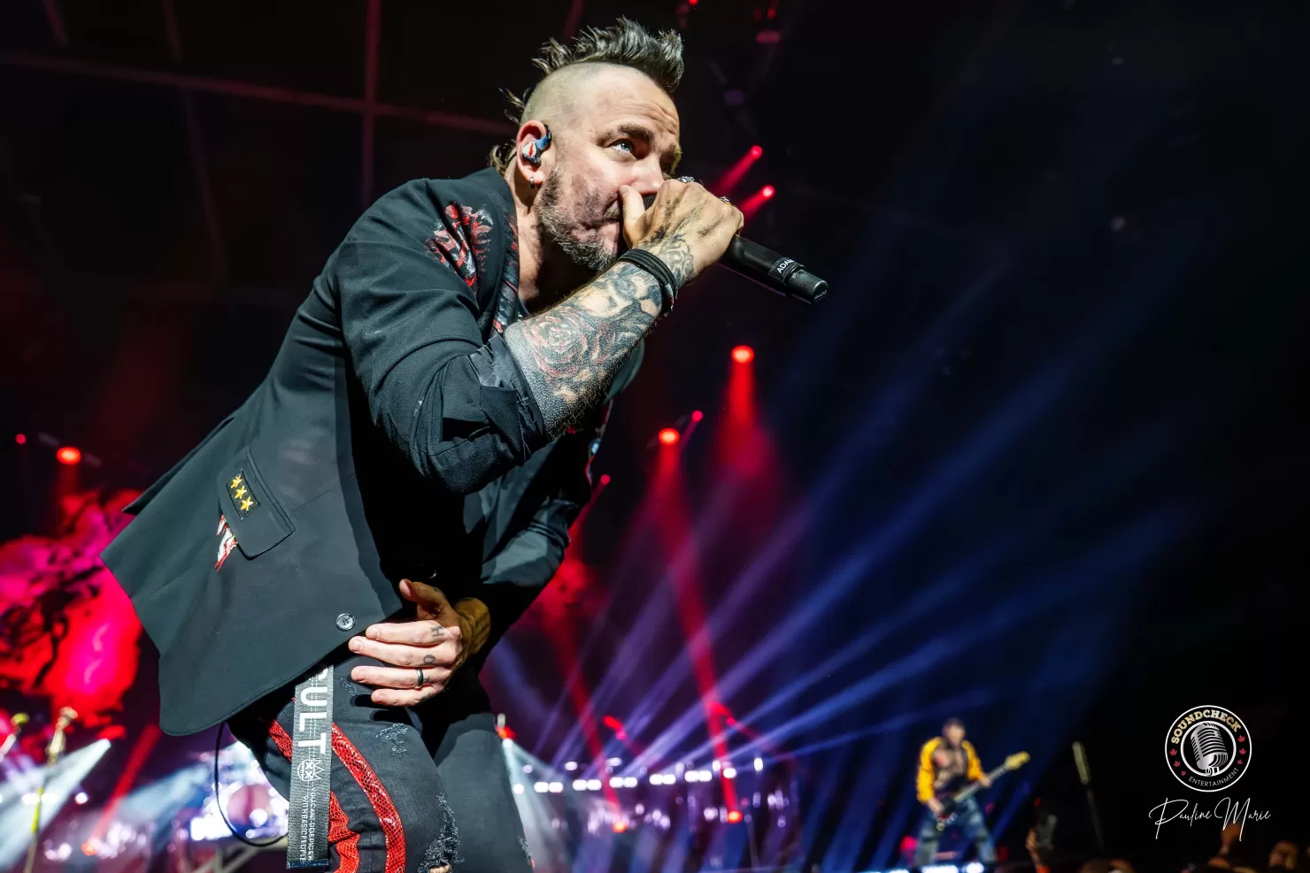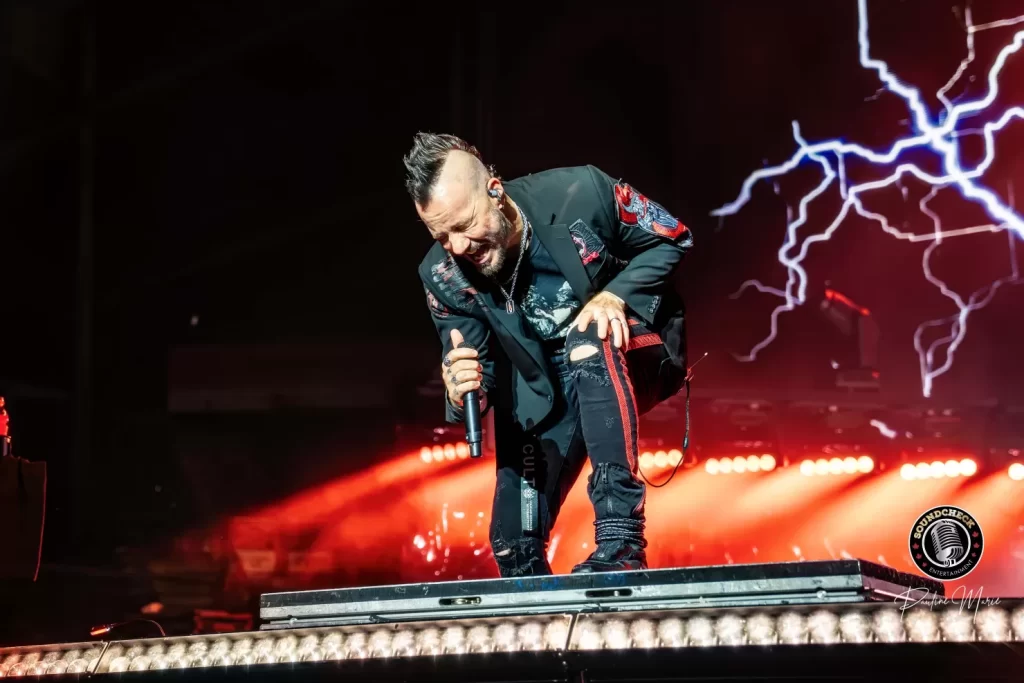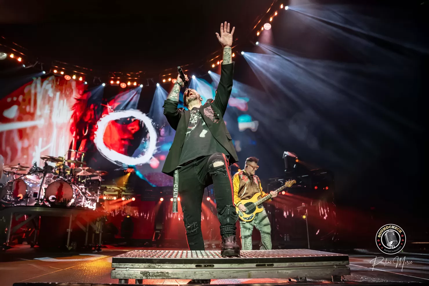 By the time Three Days Grace took the stage, the anticipation had become its own kind of electricity. The lights dropped, the arena darkened, and the roar from the crowd was deafening. Emerging through smoke, strobes, and blinding white backlights, the band launched into their set with the kind of force that makes your chest vibrate before your ears can catch up. From the first note, the audience was fully in it, moshing near the pit, fists in the air, phones lighting up the bowl, and thousands of voices shouting lyrics that have lived in people’s playlists for years.