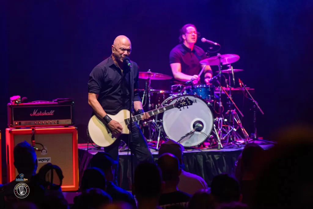 John “JC” Calabrese kept the crowd fully involved, repeatedly getting them clapping along and pulling them deeper into the songs. Behind him, Rich Knox was locked in—classic drummer muscle arms in motion, sweat pouring down his forehead, driving the band relentlessly forward.