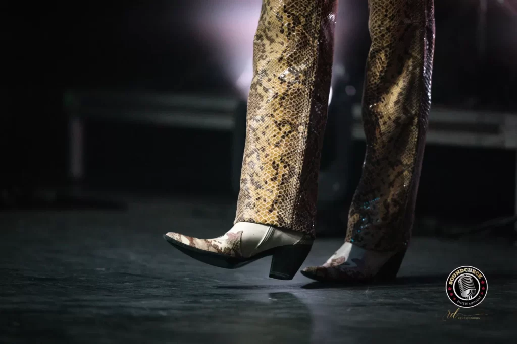 Boutilier, born and raised in Reserve Mines, Nova Scotia, grew up in a working-class Cape Breton community steeped in storytelling and music. She left home at the ripe age of 20 for Los Angeles, determined to reach the stars. Earlier in her career she performed under the name Goldilox, earning major-label attention before ultimately stepping away and reinventing herself with a sharper, more self-possessed artistic identity. That reinvention — glamorous, self-mythologizing, and unapologetically cinematic — now defines her. She strolled out carrying a bouquet of roses, clad in slick snakeskin pants, cowboy boots, dark sunglasses, and her iconic blonde french bob. A singer-songwriter and model who has worked with fashion houses including John Galiano, she understands visual storytelling as well as musical drama. Every pose felt intentional.